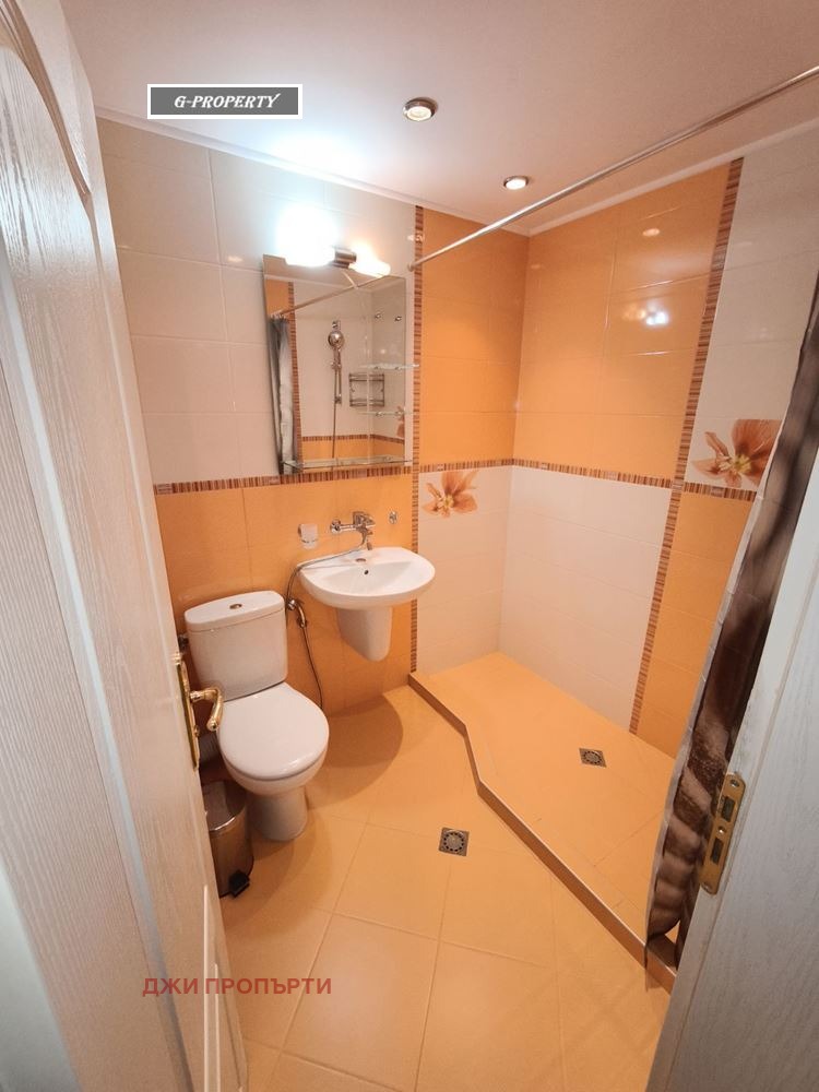 Баня с тоалетна: Свеж дизайн в слънчеви оранжеви тонове, оборудвана с душ зона.