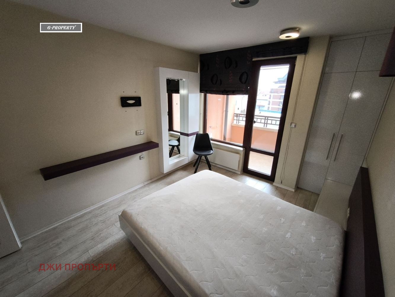 Уютна спалня: Голямо двойно легло, вградени гардероби с изчистен дизайн и излаз към тераса.