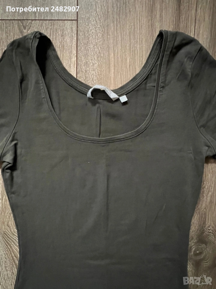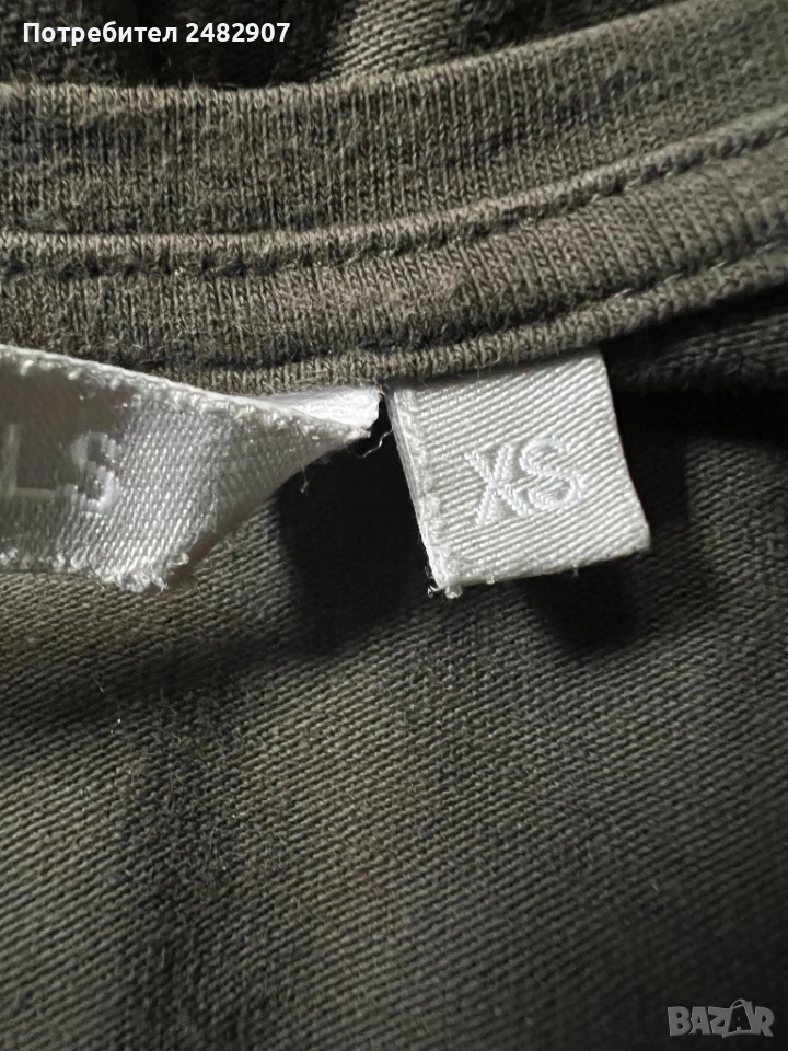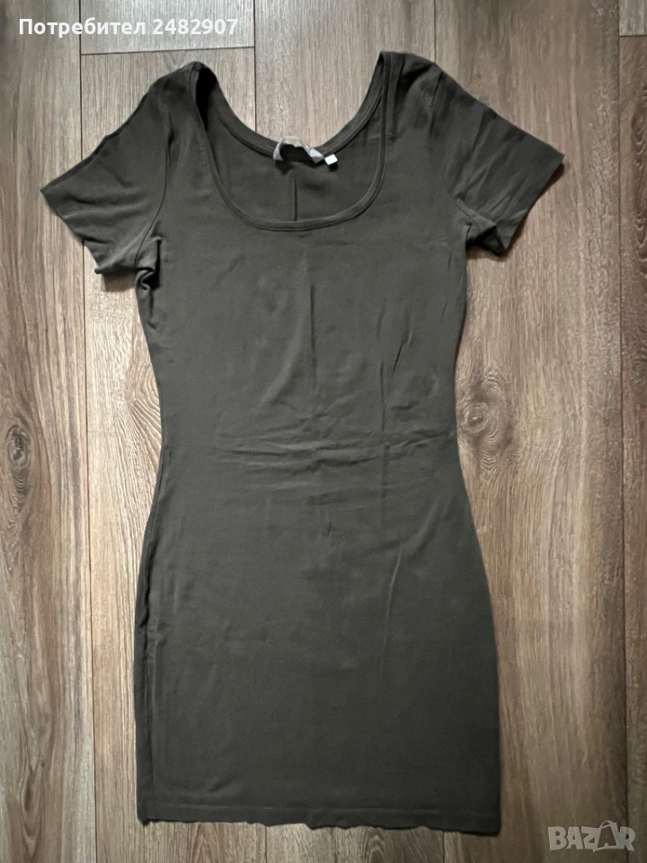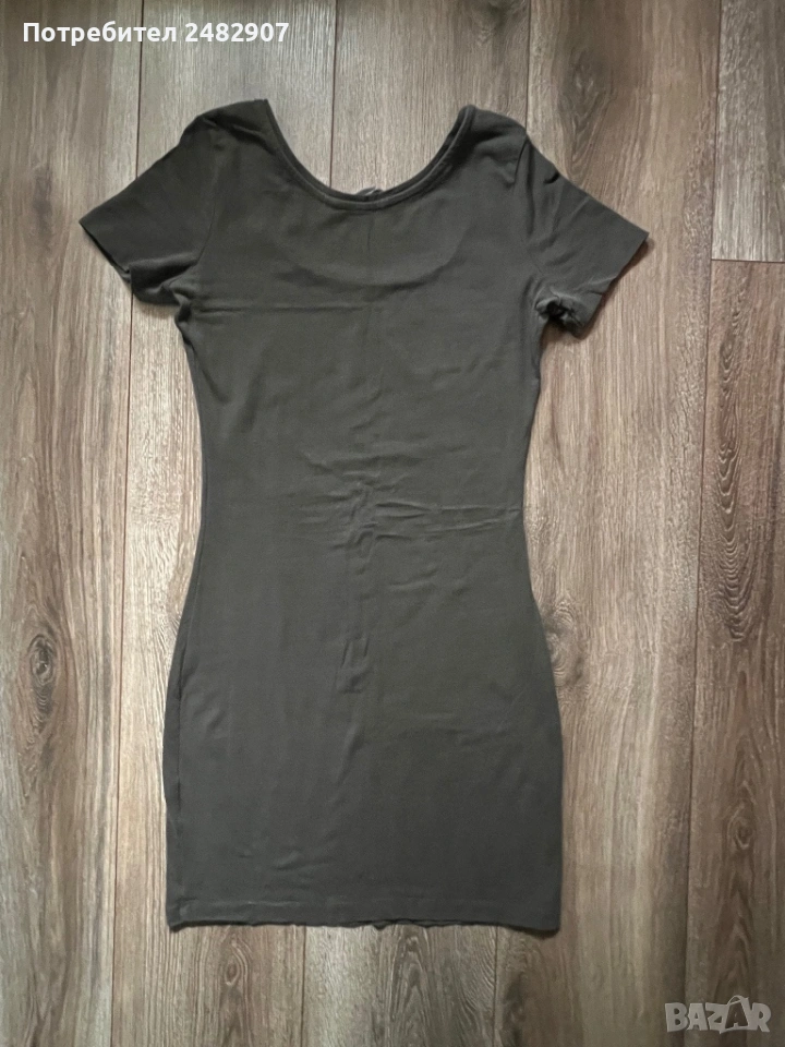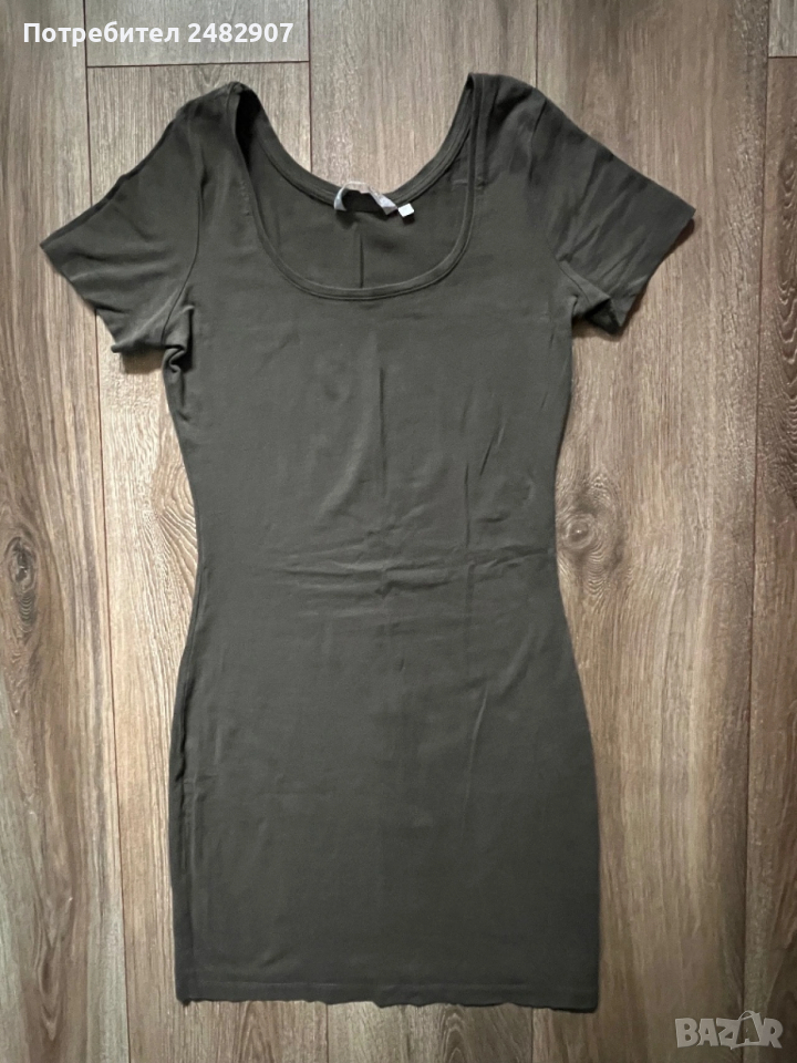 Маслено зелена къса дамска рокля, размер XS. Съдържа 95 % памук и 5 % еластан. Ширина в раменете - 31 см, ширина под мишниците - 41 см, ширина в долната част - 41 см, дължина от рамото до долу - 85 см, дължина на ръкава от рамото - 16 см, ширина на ръкава в долната част - 13 см. Много запазена, почти не е използвана.