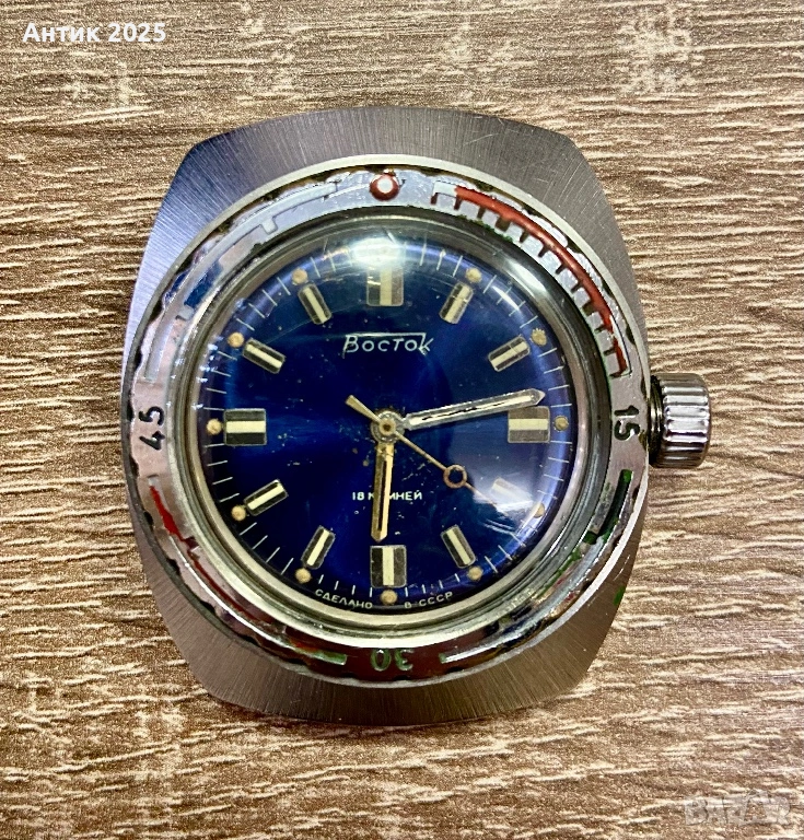 Наситено син циферблат с релефни часови маркери и въртящ се безел. Надписи на циферблата: „Восток“, „18 камъка“, „Произведено в СССР“.