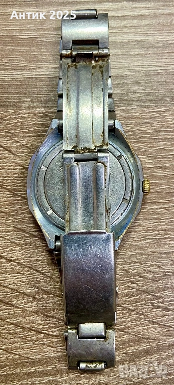 Метален корпус и метална верижка. Часовникът е във винтидж състояние: има следи от употреба по корпуса и стъклото (видими на снимките), което придава автентичен характер. Подходящ за колекция, подарък или ежедневно носене в ретро стил.