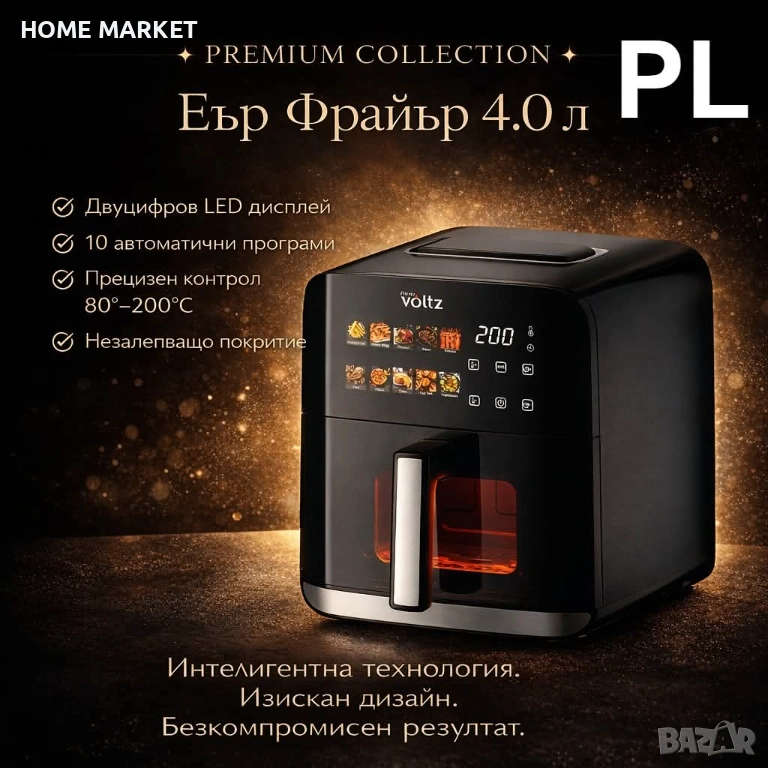 Фритюрник Air Fryer Oliver Volzt OV51980CE, 1200W, кошница 4 л., LED дисплей, 10 предварително зададени програми, Таймер