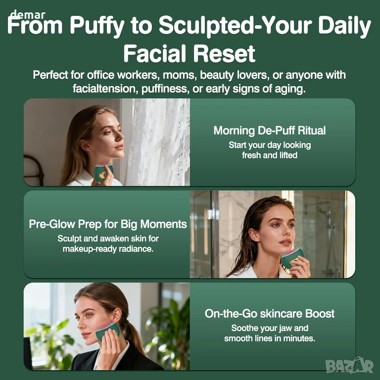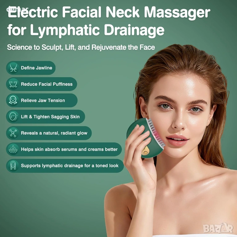 Електрически масажор за лице за лимфен дренаж, 3 нива, 9 режима, зелен
