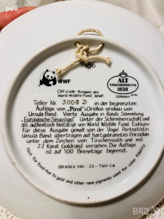 Колекционерска порцеланова чиния на Ursula Band, част от серията “European Song Birds". Диаметър 20 см . Цена 15€/29,34 лв.
