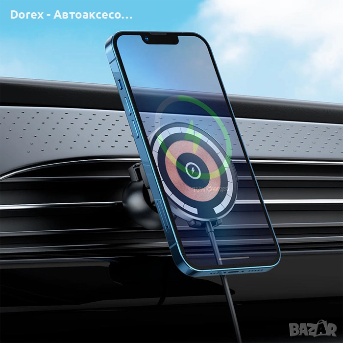 Стилна и интелигентна стойка за телефон с вградено безжично зарядно от ново поколение. Позволява удобно и бързо зареждане на смартфона по време на шофиране.