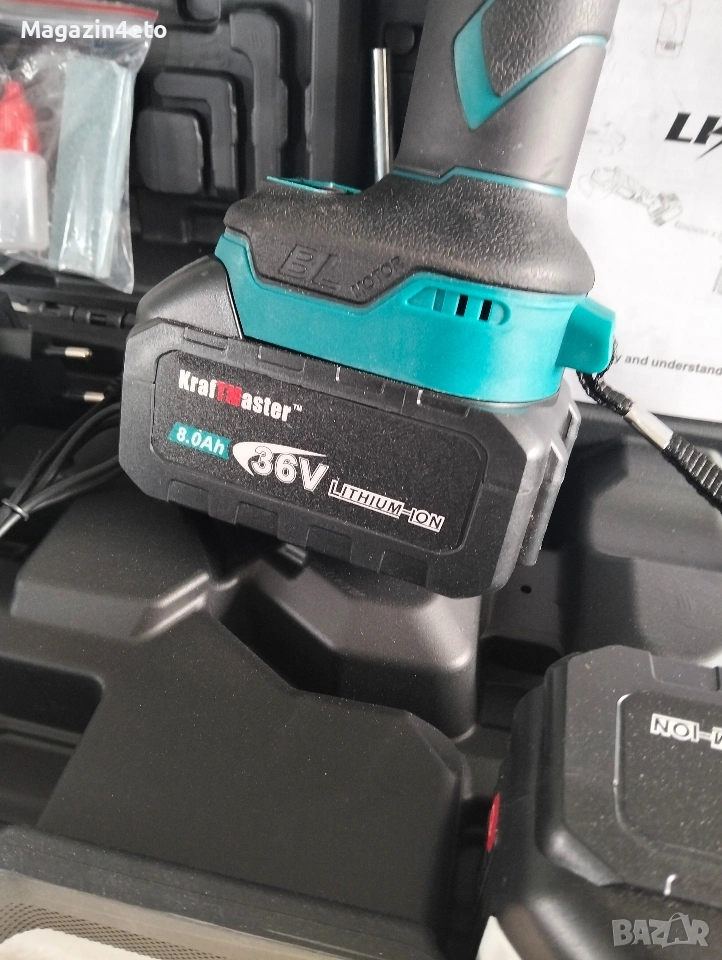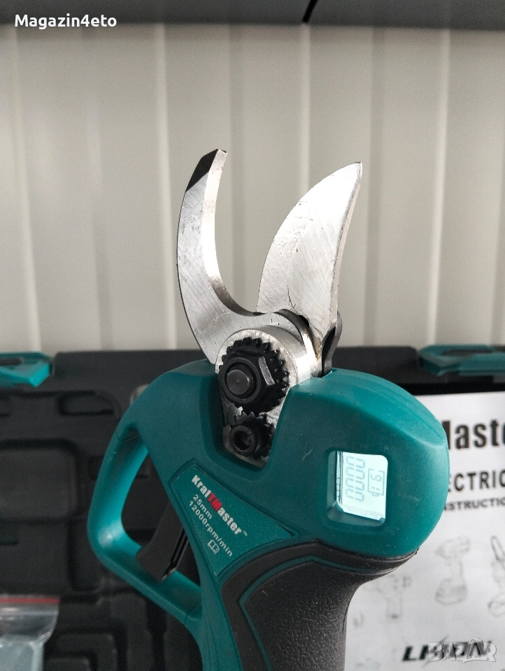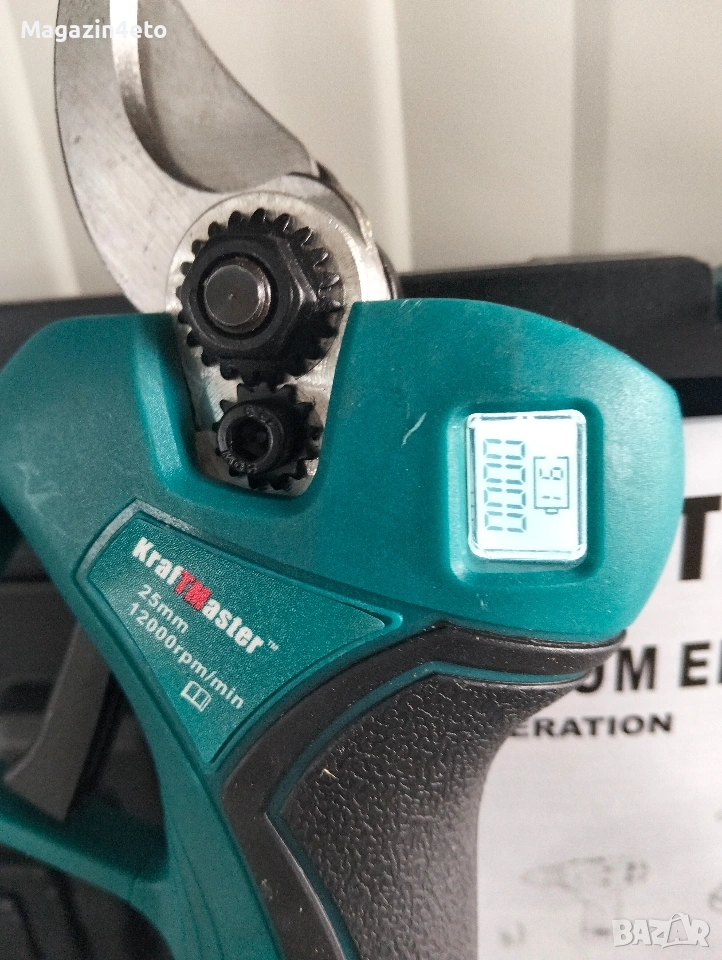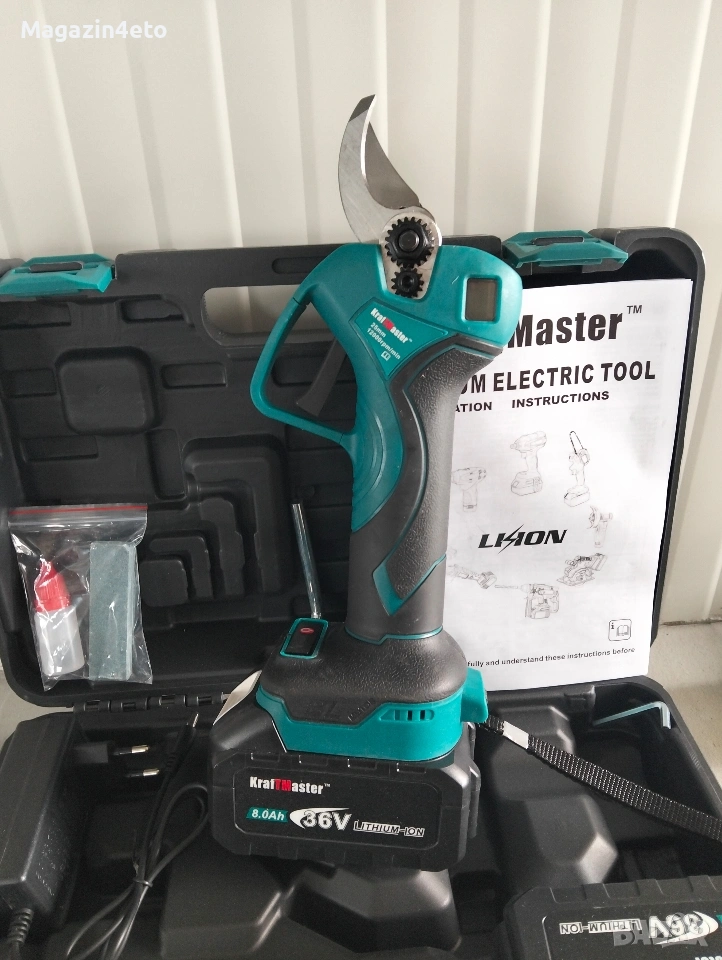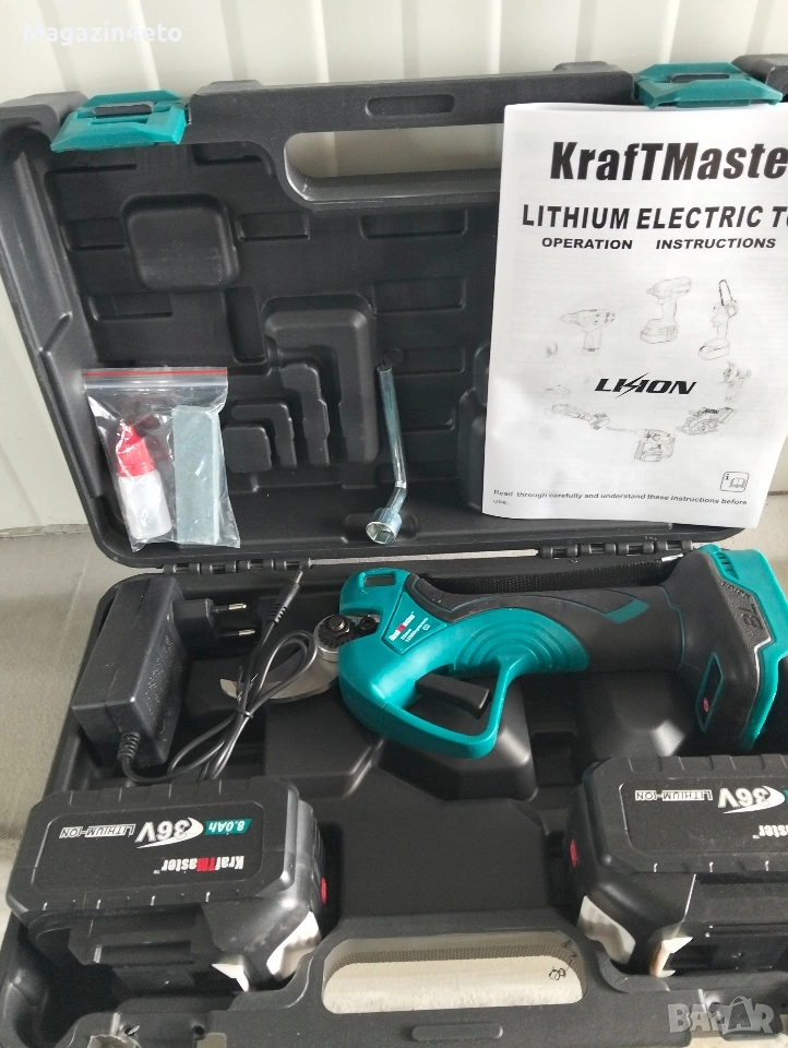 Ножицата е нова,неизползвана.В комплект с две батерии,зарядно устройство,точило,ключ и масло.