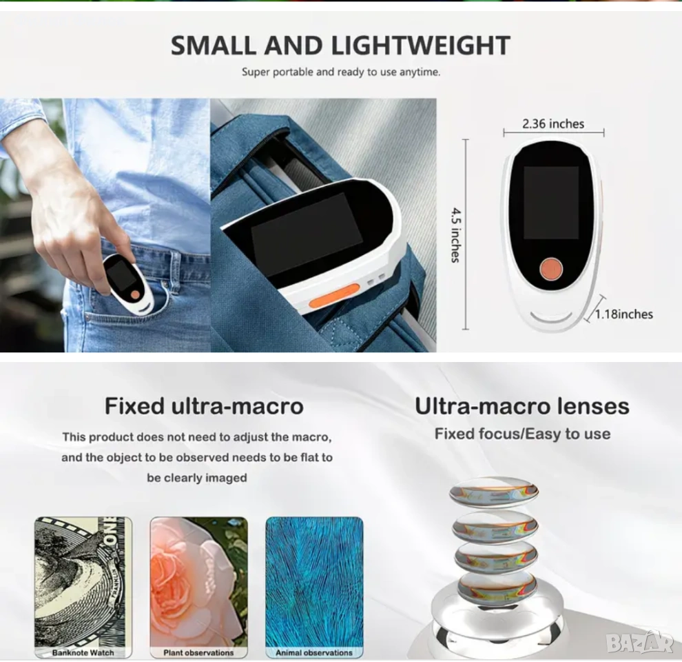 Качествен ръчен цифров микроскоп с 500х увеличение, 2 инчов IPS екран и 8 регулируеми 3- степенни LED светлини. Идеален за учебните нужди и хобито на любителите на науката. Подходящ е за електронна подръжка и биологично наблюдение. Лесен за употреба с възможност за заснемане на изображения, съвместим с Windows и Mac OS компютри. При реален интерес е възможен разумен коментар на цената