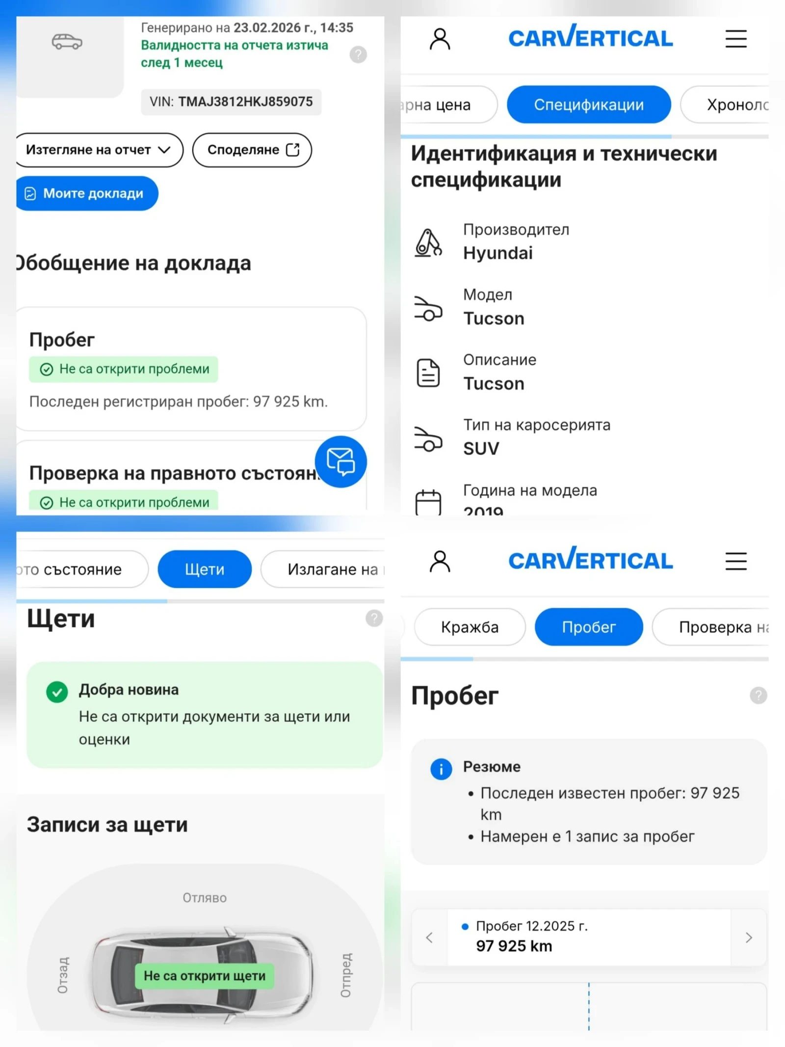Здравейте приятели . Представям на вашето внимание Hyundai TUCSON 1. 6TGDI бензин FACELIFT 177 конски сили, 4x4 HTRAC - интелигентна система , която разпределя усилието на движение на всяка гума. EuroB6d. Нов внос Швейцария. Един собственик 1967 набор описан в оригиналния швейцарски талон, гаражен автомобил. 2 броя оригинални ключа KEYLESS . Специално изпълнение пакет за Швейцария с 5 годишна гаранция без пробег на километрите. Мотор с верига . Реален пробег с пълна сервизна история -99 000 км до момента, като по сервизна история маслото и филтрите бяха за смяна и са сменени тук с масло MOTUL 5 W 30. Задни и предни дискове и накладки на 90 %. Автомобила е преминал технически преглед на 14. 15. 2024 в Швейцария , който е валиден до 14. 05. 2027 там, упоменато в оригиналния швейцарски талон. Дата на първа регистрация 15. 04. 2019 година. По екстериора: Бял цвят , led дневни светлини , халогени , LAZER LIGHTS, осветяване в завой, разпознаване на пътните знаци. Асистент на дъглите светлини. Следене на лентата, autohold спирачка за светофар, различни режими на каране, START STOP SYSTEM. Следене на налягането в гумите(TPMS). Sound System Digitalradio (Digital Audio Broadcasting DAB+), мигачи в огледалата , оригинални двуцветни джанти Hyundai със зимни гуми 18 " UNIROYAL THE RAIN TYRE SUV 225/60/18 SUV 4X4 на 80 % , Оригинален заден и преден парктроник с графика и звук , който показва къде има препятствие в таблото . Разпознаване на знаци. По интериора : Кожен салон от естествена кожа, мулти волан, от който се управлява радиото , CD, MP3, WMA, телефон, както и автопилота. Слушане на музика посредством bluetooth, USB/ AUX/ MP3, APPLE CAR PLAY/ANDROID AUTO. WIRELESS безжично зарядно за телефон. Шито табло с кожа. Оригинална навигация и камера за заден ход. Автоматични фарове и автоматични чистачки със сензори на предното стъкло. Кожен волан и скоростен лост. Централен подлакътник отпред и един централен отзад с места за чашки. Автоматична скоростна кутия. Среден разход за последните 9000 километра 9 литра по бордкомпютър. Щора в багажника , компресор с гел, оригинален теглич който си личи, че е чисто нов с 2 ключа . Двузонов климатроник. Странични огледала с подгрев и прибиране. Хелиоматично огледалото за обратно виждане против заслепяване от светлини. Тонирани стъкла, като задните са по-затъмнени заводско. Подгряване на предните седалки. 4 броя оригинални мокетни стелки. Салона е изключително запазен . Вградена аларма и имобилайзeр. Система ISOFIX. Система против на колизии, Brake Assist , която предотвратява удар ако изгубите внимание. Система за спускане на наклон. Рейлинг на покрива за монтаж на греди за ски или куфар. Надуване на шофьорската седалка в кръста, предните 2 седалки са електрически. Без ръжди и корозия по ходовата част. Чисто нов акумулатор AGM за START STOP системата. Колата е в много добро състояние екстериор-интериор. Обмитена е и се продава с договор за покупко - продажба и фактура без необходимост от нотариус. Цялостното състояние на колата е качваш се и караш , без да е необходимо ходене по сервизи за момента. По автомобила не е имало интервенции , което може да бъде проверено по рамата , която е описана. При интерес могат да бъдат представени снимките на закупуването в Швейцария. Изкарана е по VIN номера информацията от Carvertical , за да се докаже , че по колата не е имало никакви маниполации , както и идентичността на километрите. Автомобила е преминал детайлно почистване и полиране в детайлинг студио където е сниман. VIN номер: TMAJ3