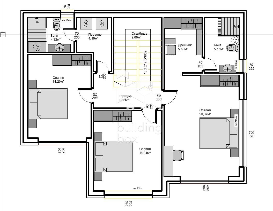 -ЕТАЖ 2 : Родителска спалня със собствена баня, дрешник и излаз към тераса - 31.12 кв. м., две детски спални - 14.84 кв.м. и 14.20 кв.м., перално помещение - 4.19 кв.м., второ санитарно помещение - 4.32 кв.м..