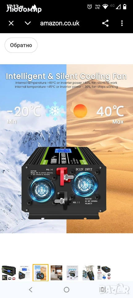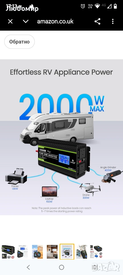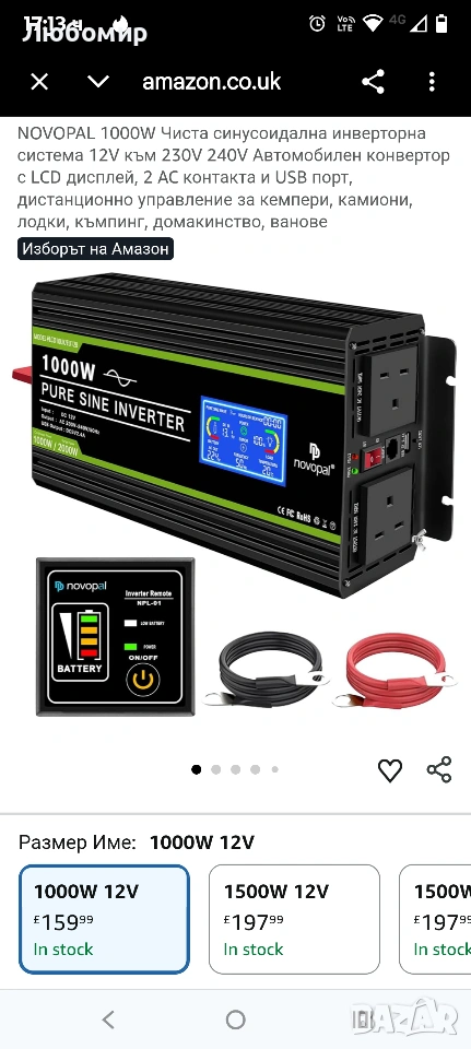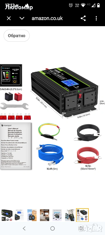 Списък на пакета: 1x инвертор 12v към 240v 1000w, 1x ръководство за потребителя на английски език, 1 комплект кабели за батерии (1x червен, 1x черен), 1x дистанционно управление
