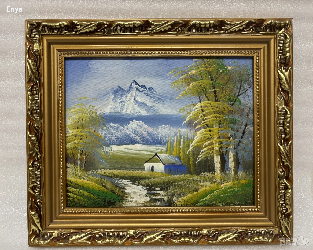 Маслена картина на пейзаж с брези и снежна планина в стил Боб Рос.
