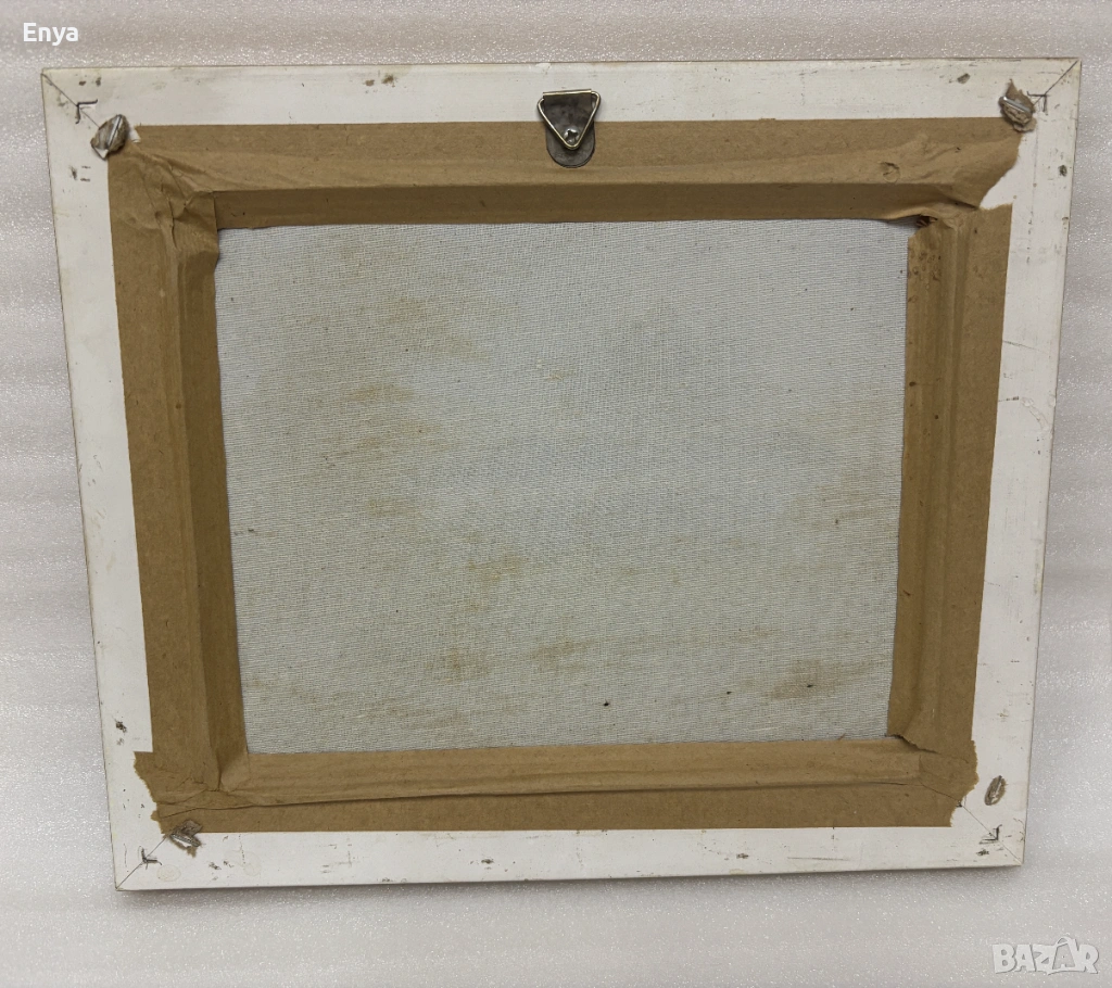 Върху платно, рамкирана с богато украсена с орнаменти златна рамка.