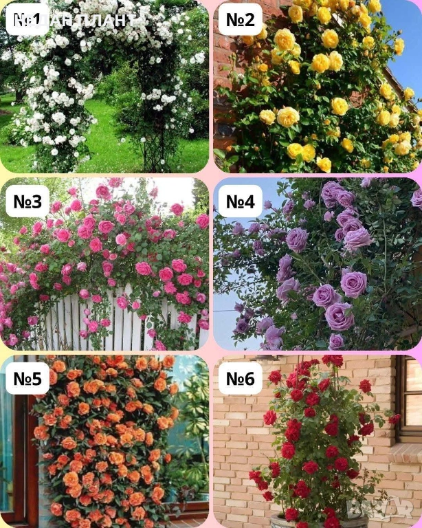 Влачещи (катерливи) рози от номер 1-6 – образуват дълги, гъвкави клонки и са идеални за арки, огради и стени. Цъфтят обилно и създават впечатляващи цветни каскади.