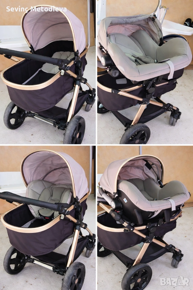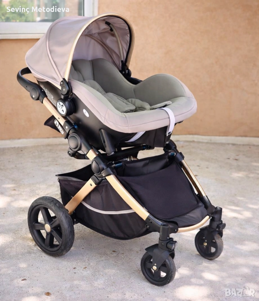 Бебешка количка 3 в 1 със златиста рамка – много запазена Продавам бебешка количка комплект 3 в 1 в отлично състояние. Комплектът включва: ✔ Кош за новородено ✔ Лятна седалка ✔ Столче за кола (кошница) ✔ Покривало ✔ Долна кошница за багаж Характеристики: Здрава и стабилна златиста алуминиева рамка Големи гуми, подходящи за всякакъв терен Лесно сгъване Регулируем сенник Мека и удобна вътрешна част Количката е много маневрена и удобна както за града, така и за разходки по неравни терени. Използвана е, но е добре поддържана и всичко функционира нормално. Цена: 80€ Тел:0896782152