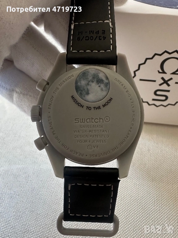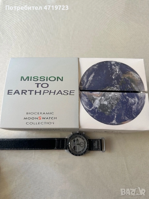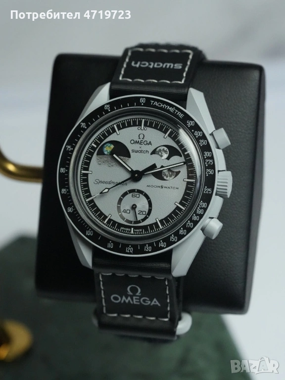 Часовникът е част от култовата колаборация между Omega и Swatch с дизайн, вдъхновен от легендарния Speedmaster Moonwatch, в по-достъпна Bioceramic версия с характерната Earthphase индикация.