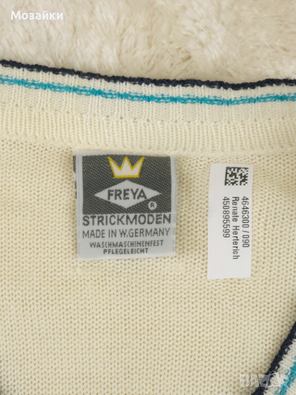 Рядко попадение: винтидж плетиво Freya Strickmoden, произведено в West Germany (W. Germany) – детайл, който сам по себе си вдига стойността и колекционерския интерес. Това е точно онзи тип “истински винтидж” дреха, която се усеща качествено още от първото докосване.