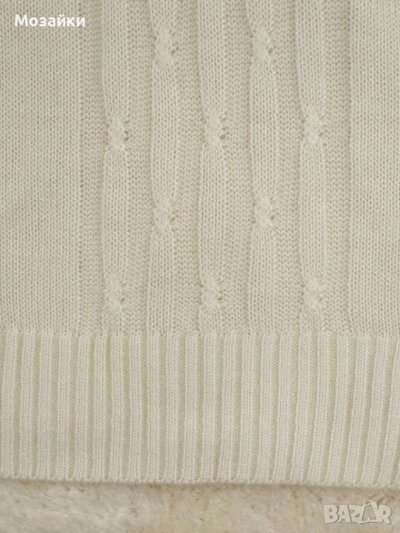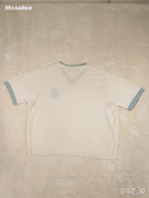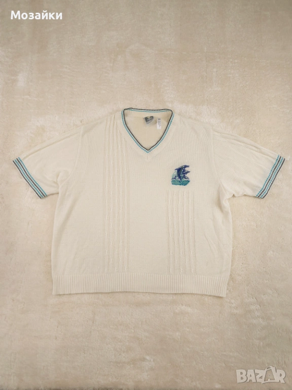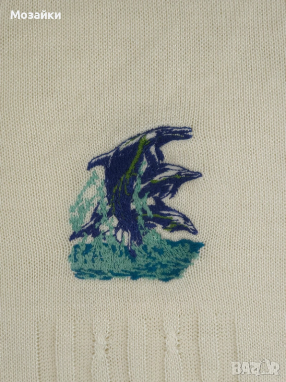 Съставът е 60% акрил / 40% virgin wool, което дава идеален баланс: стои меко и удобно, но запазва форма и има леко “премиум” усещане като класическите плетива от 80-те. Моделът е с V-образно деколте, релефна плетка отпред и красиви контрастни линии по яката и ръкавите. Бродираният детайл на гърдите прави дрехата още по-уникална и винтидж.