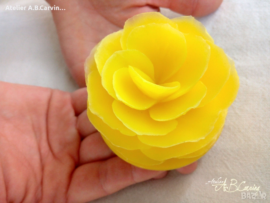 Вдъхнете живот на вашата декорация с нашия ароматен гравиран сапун 'Бегония'. Това не е просто сапун, а малка скулптура, създадена с изключително търпение и прецизност. Всяко цвете се изрязва изцяло на ръка с нож, без използването на калъпи или молдове, което прави всяка 'Бегония' единствена по рода си. Дизайнът улавя нежната многопластовост на истинското цвете, превръщайки глицериновата база в ефирен декоративен елемент. Сапунът излъчва фин аромат и е прекрасен акцент за интериора или уникален подарък за хора, които ценят автентичното занаятчийско изкуство. С този продукт вие получавате авторско произведение, в което личи почеркът на майстора и вниманието към всеки детайл.