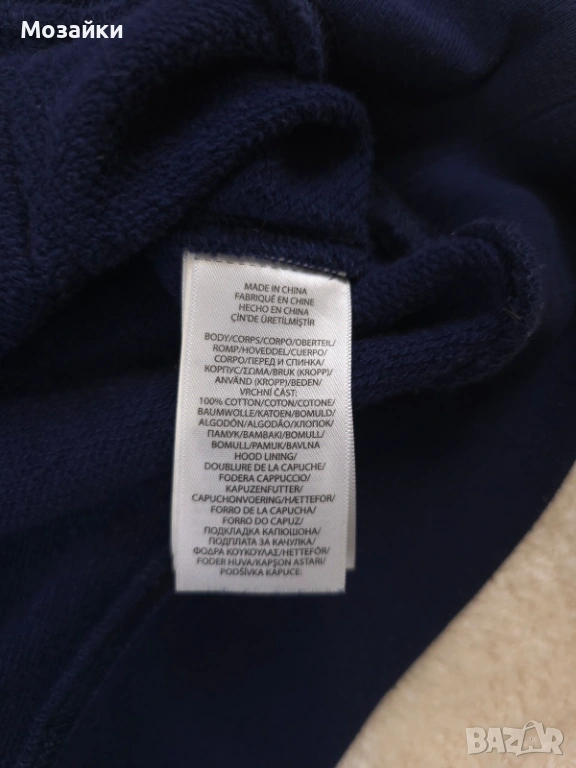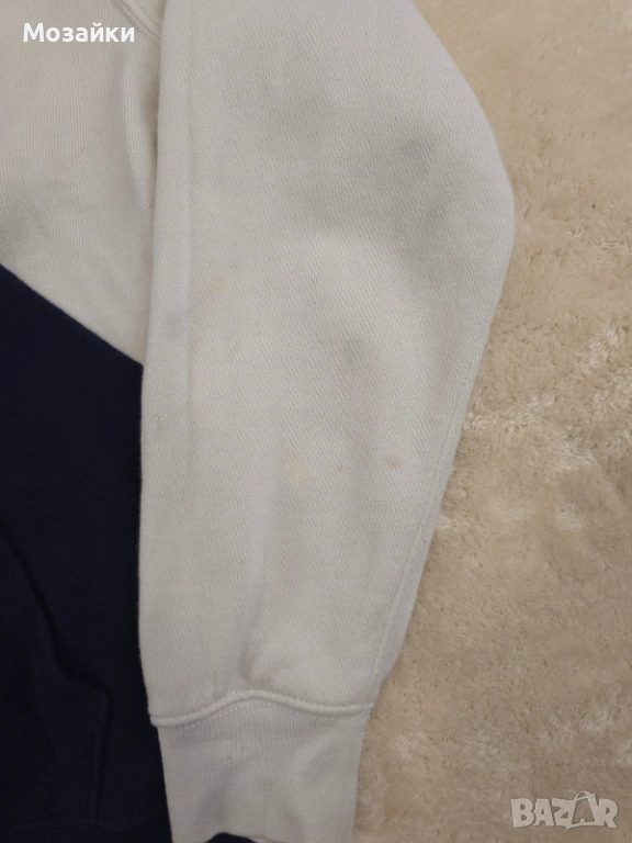 Материята е 100% памук и е в супер състояние – плътна, мека и изобщо не е износена, не е разтегната и няма уморен вид. Реално худито е топ като качество, но има няколко петна по светлата част.