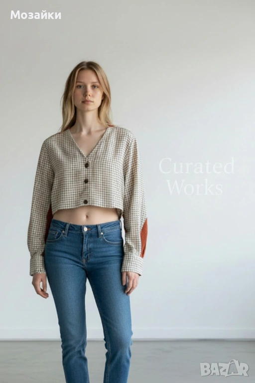 Дизайнът е с фино каре и контрастни ръждиви детайли по ръкавите и яката, което прави дрехата да изглежда много по-скъпа и добре измислена. Кройката е по-къса (cropped), което стои супер модерно – особено с висока талия.