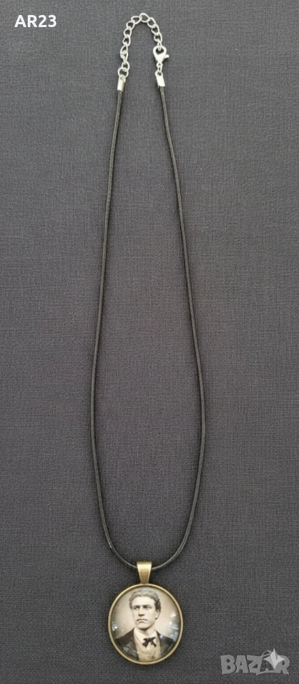 Елегантен медальон с портрет на Васил Левски, Апостола на свободата. Кръгъл медальон с диаметър 2.5 см в антично злато, с черно-бял исторически портрет под защитно стъкло. Окачен на тъмен кожен шнур с удължаваща верижка и карабинка от сребрист метал за удобно регулиране.