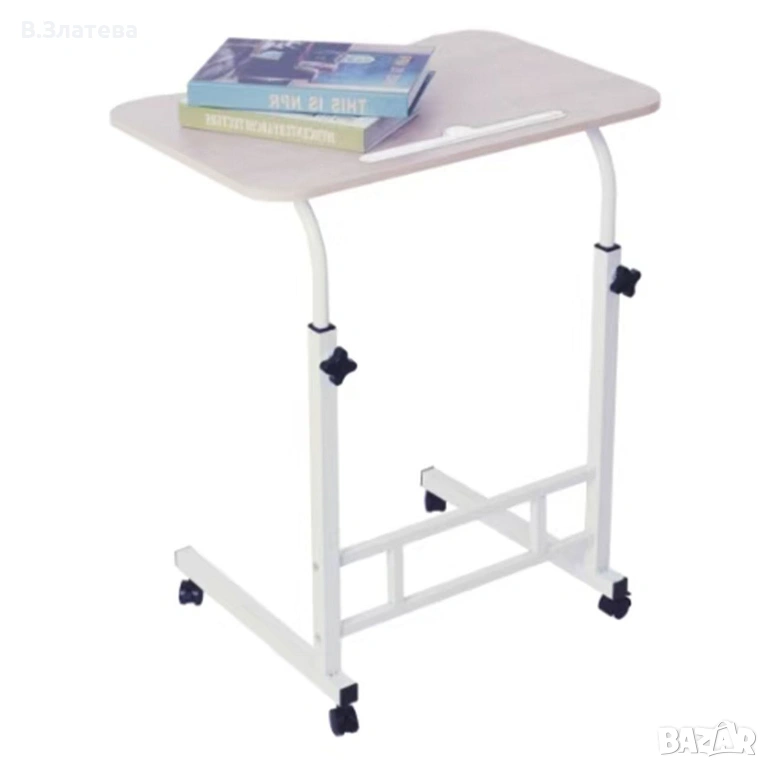 бюро с дървена повърхност (MDF), метални крака и колелца. Повърхността има