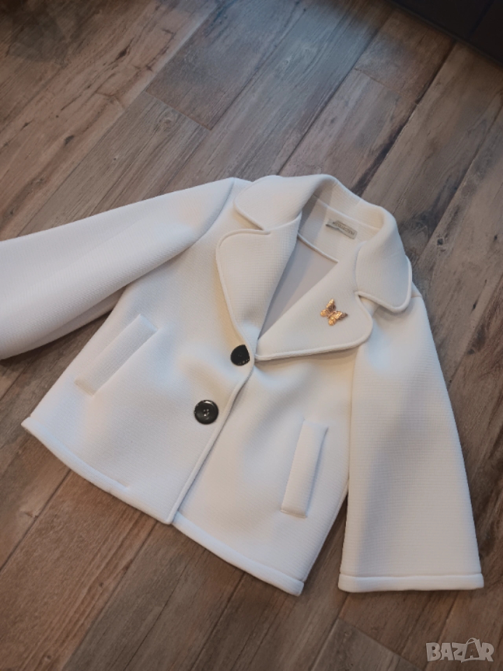 Ново луксозно бяло преходно палто,манто с кокетна брошка.Подходящо за всеки повод . РАЗМЕР S,M,L