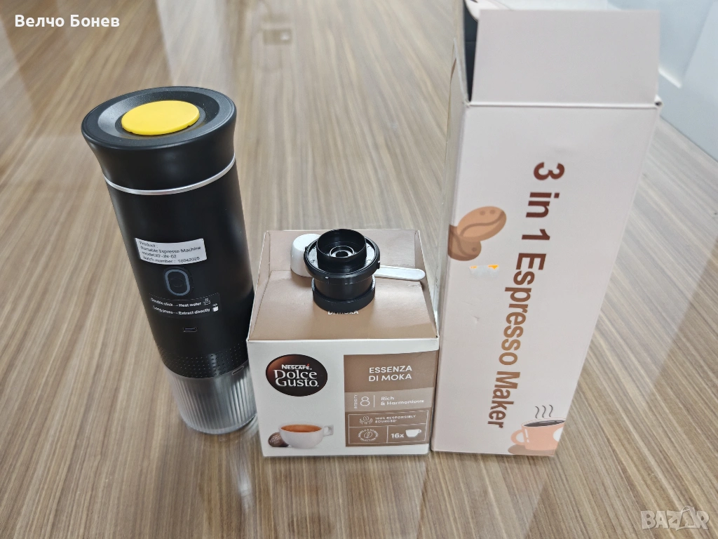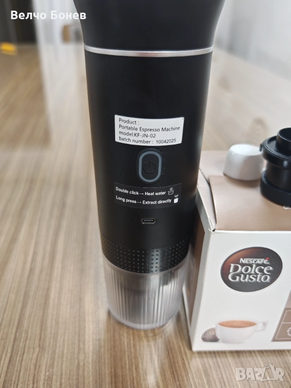 Продавам преносима кафе машина в отлично състояние, модел KF-JN-02. Компактна, удобна и идеална за туризъм, къмпинг, пътуване, офис или автомобил.
