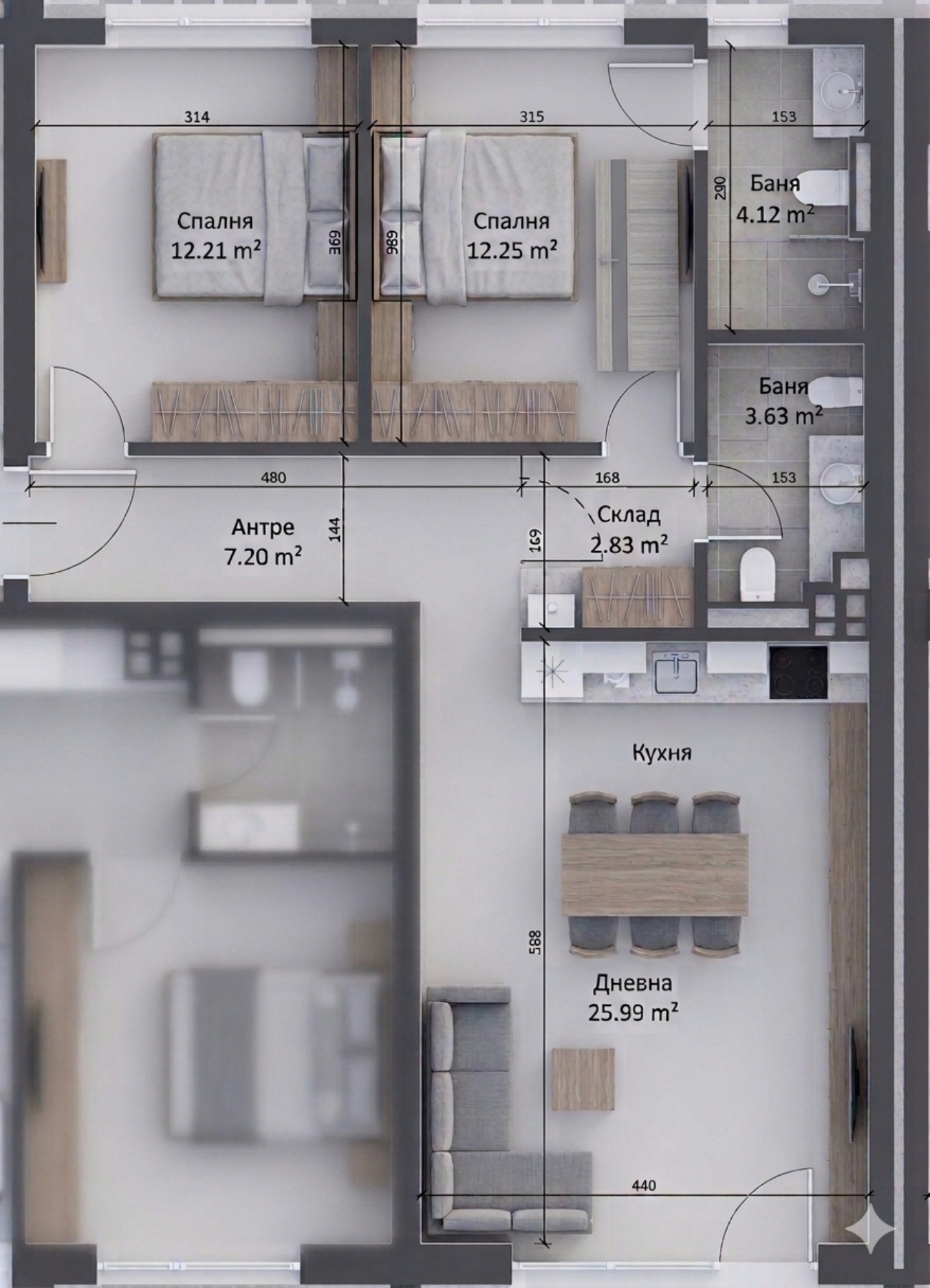 - Имота се състои от: антре, просторна дневна с кухненски бокс с изложение юг (26 кв.м чиста площ) и прекрасна гледка вътрешните зелени площи на комплекса. Две непреходни, еднакви по големина спални. Две бани с тоалетна и мокро помещение/склад. Едната баня е към родителската спалня.