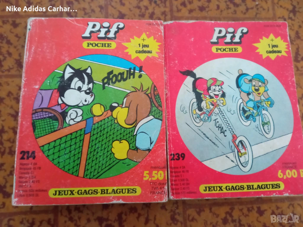 Три броя от любимия комикс на няколко поколения - ''Пиф''. Единият е със захабена корица, както се вижда, но това е съвсем разбираемо - той е от 1965 година (иначе страниците са в доста добро състояние, особено за годините си). Другите 2 броя са доста по-запазени, те са от 1983-а и 1985 г.