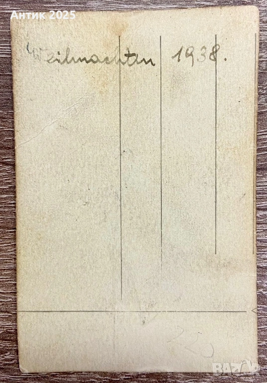 Оригинална винтидж фотография от 1938 г., изобразяваща млад войник от Вермахта в парадна униформа. На гърба има ръкописен надпис „Weihnachten 1938“ (Коледа 1938), което потвърждава датировката на снимката.