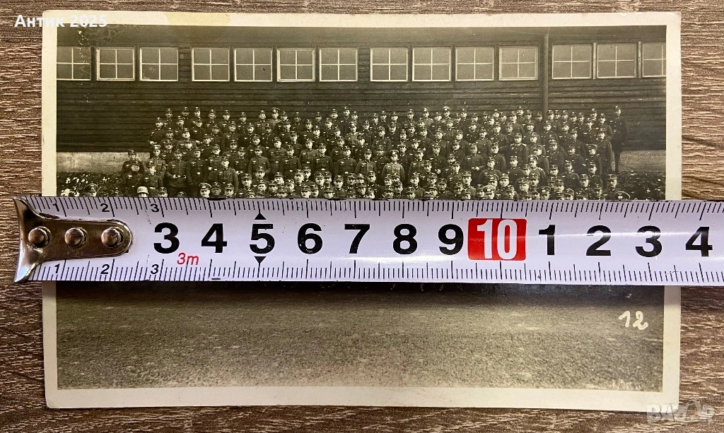 На фотографията е изобразен многоброен състав военнослужещи (предполагаемо учебно подразделение или офицерско училище), подредени пред сградата на казарма. Детайлната униформа, отличителните знаци и снаряжението правят снимката особено интересна за колекционери на военна история и изследователи на епохата от началото на XX век (ориентировъчно 1910–1930 г.).