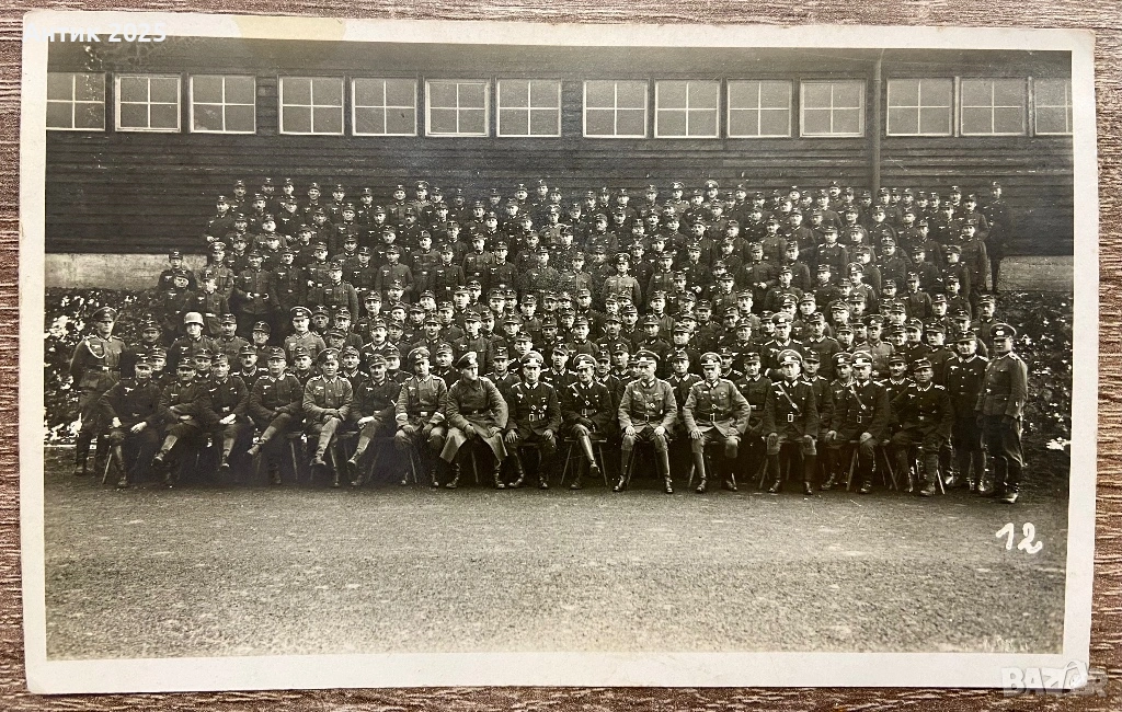 Оригинална винтидж фотография с голям групов портрет на военни в униформа. Снимката е направена в Германия, което се потвърждава от печата на гърба: Photo-Hepperlin, Hammelburg, Tel. 19.