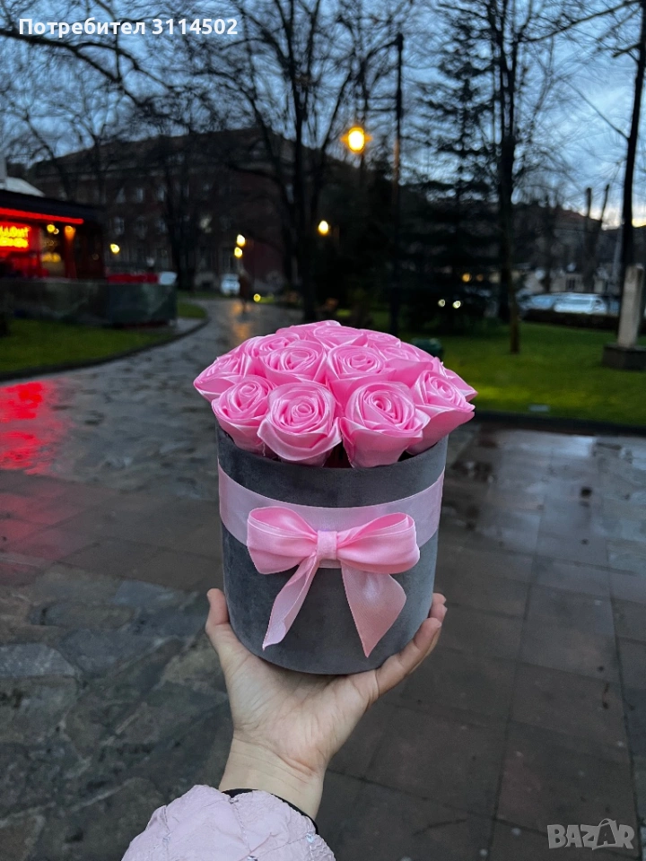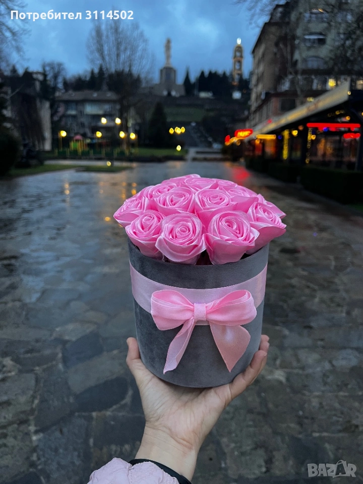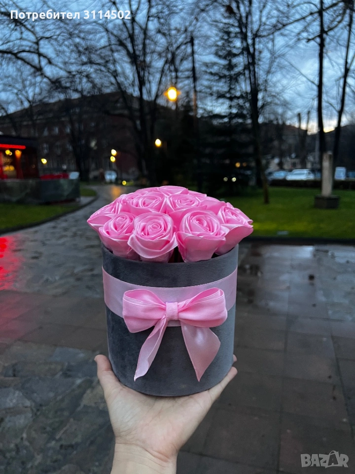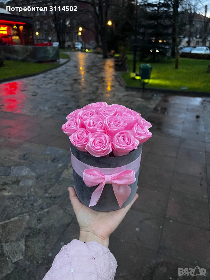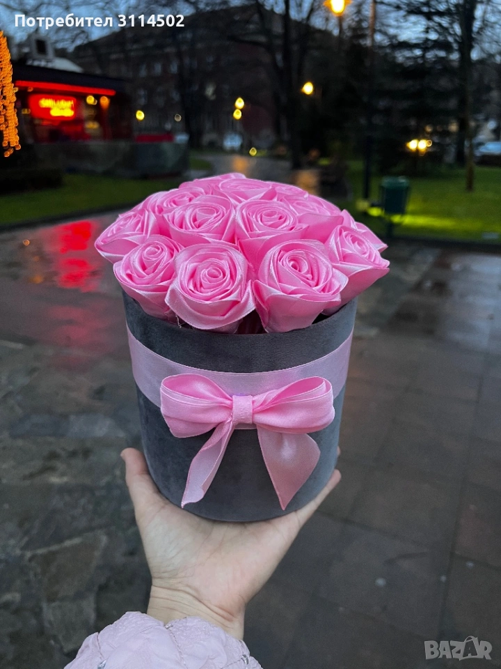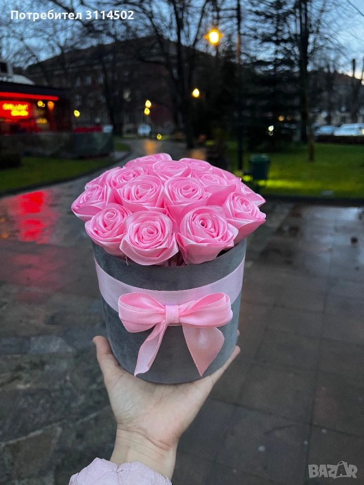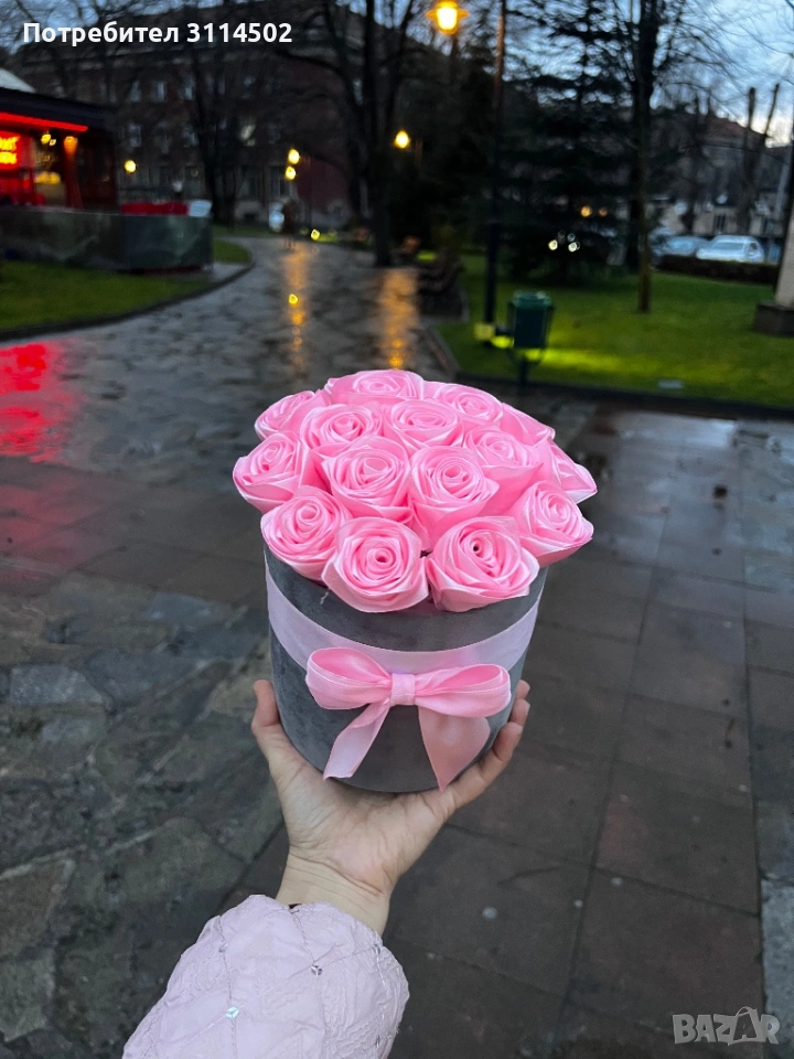 Луксозна кутия с 17 розови сатенени рози – ръчна изработка → Обява 53597308