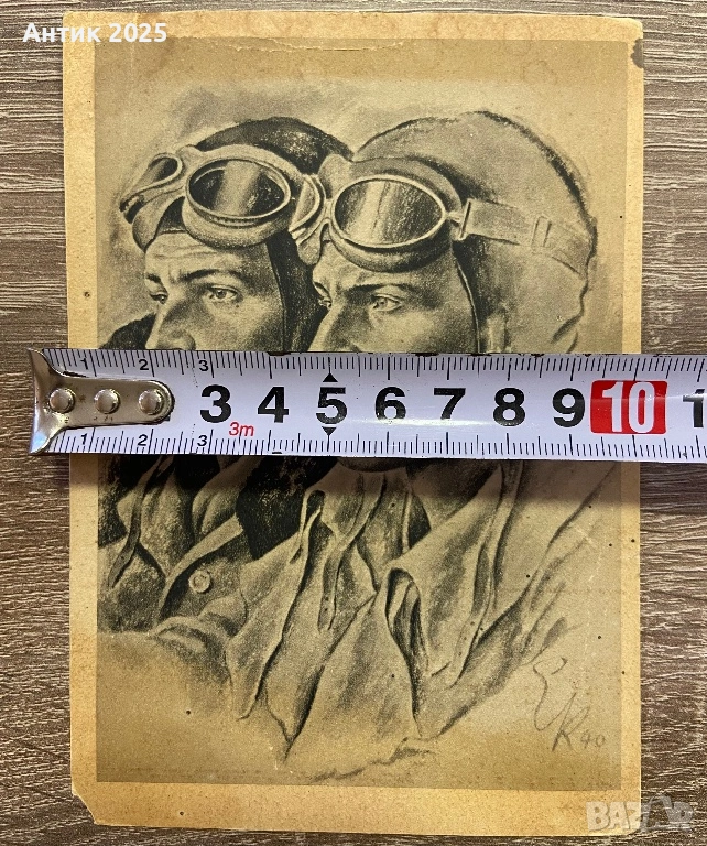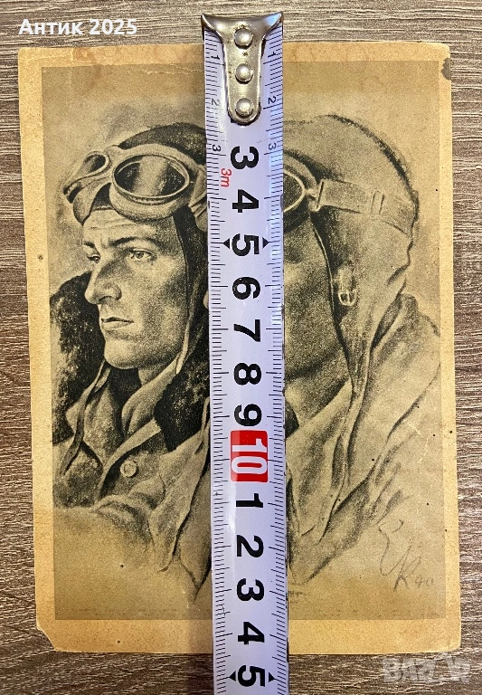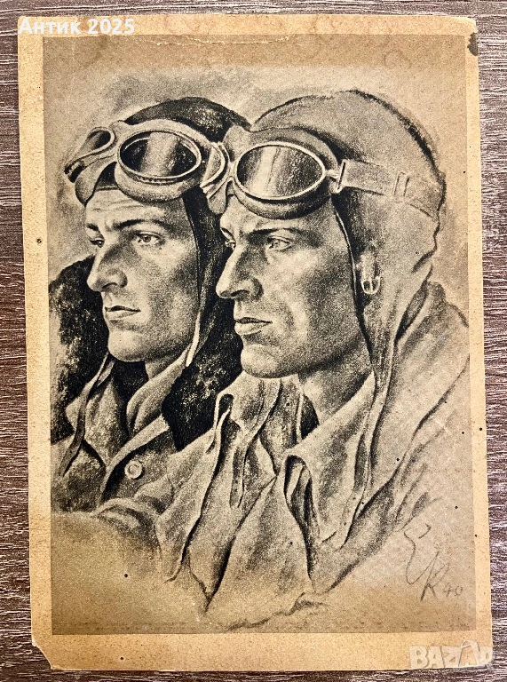 Оригинална немска пощенска картичка от периода на Втората световна война с художествено изображение на двама военни пилоти с шлемове и защитни очила. Рисунката е изпълнена в графична техника и е подписана „K 40“, което сочи към 1940 година.