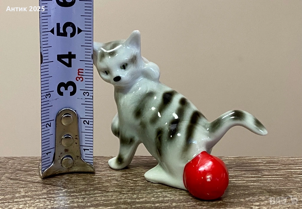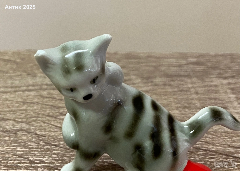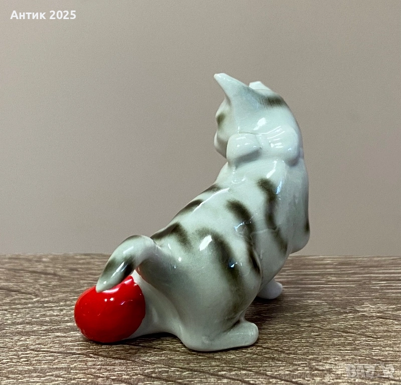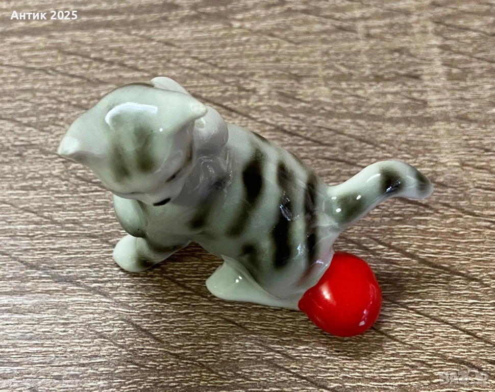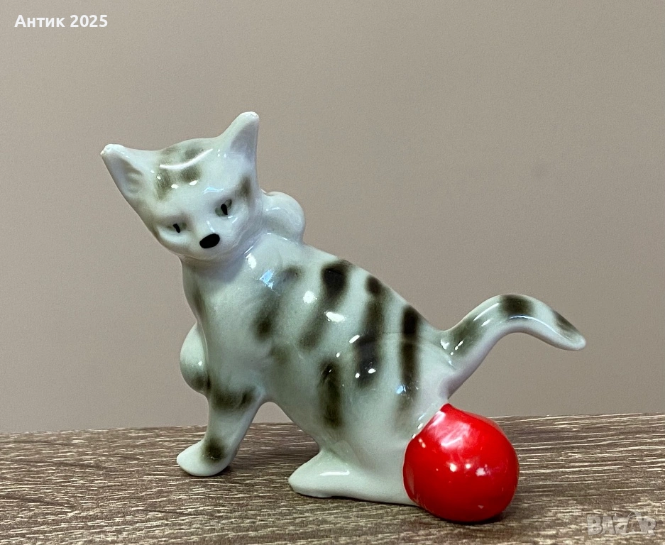 Очарователна винтидж фигурка на коте от глазиран порцелан. Котето е изработено в сиво-бели нюанси с тъмносиви райета и играе с ярка червена топка. Изразителната муцунка и игривата поза придават на фигурката жив характер.