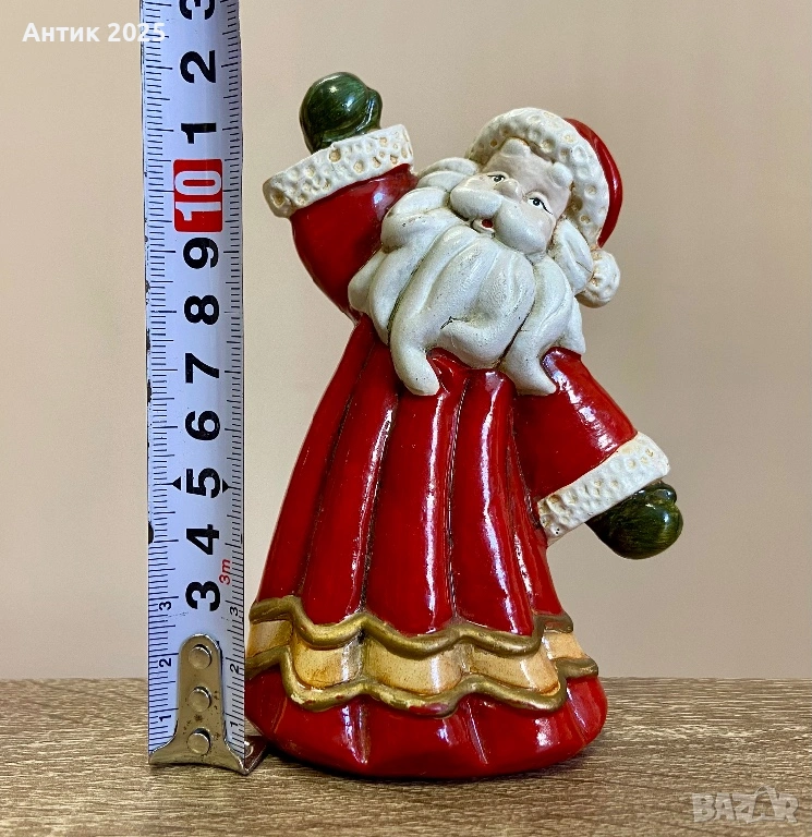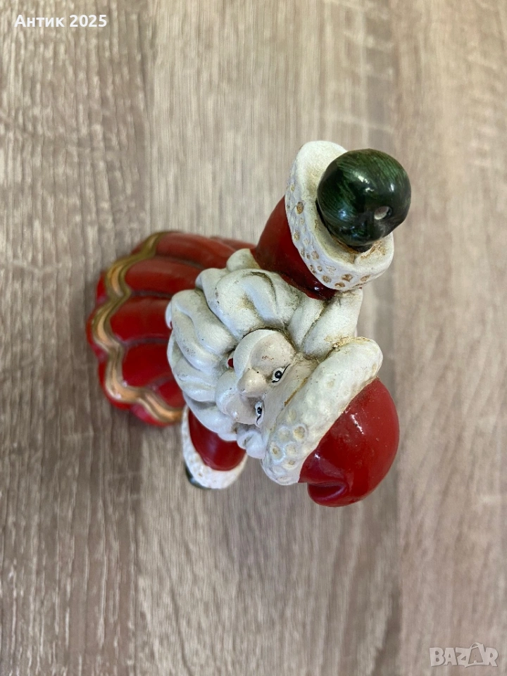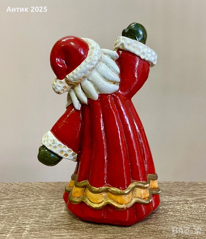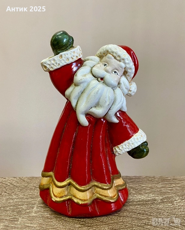Винтидж керамична фигурка на Дядо Коледа в ярко червено облекло със златист кант и зелени ръкавици. Покрита с гланцирана глазура, с добре изработени детайли по лицето и брадата.