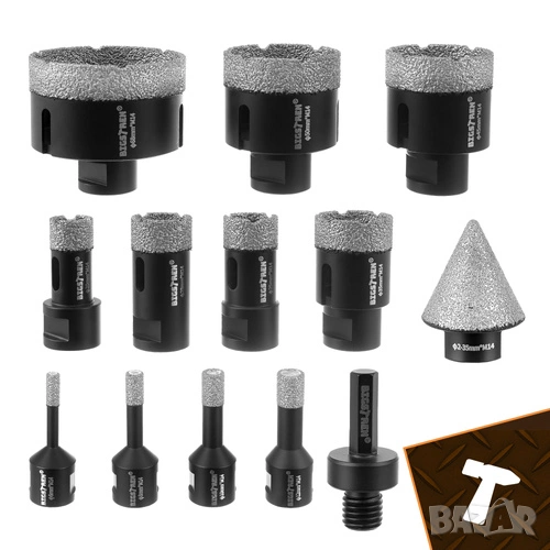 И двата комплекта са проектирани за дълъг експлоатационен живот и стабилна работа. Диамантената режеща част с височина до 15 мм и двойният слой диаманти осигуряват висока скорост на рязане и устойчивост на износване. Боркороните могат да се използват както на сухо, така и на мокро, като водното охлаждане значително удължава живота им. Съвместимостта с резба M14 и включеният адаптер позволяват използване както с ъглошлайф, така и с бормашина, а здравият куфар осигурява удобно съхранение и пренасяне.