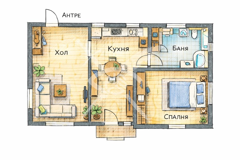 РАЗПРЕДЕЛЕНИЕ: Къщата разполага с площ от 75 кв.м. разпределена във входно антре, хол, отделна кухня, спалня и баня с тоалетна.