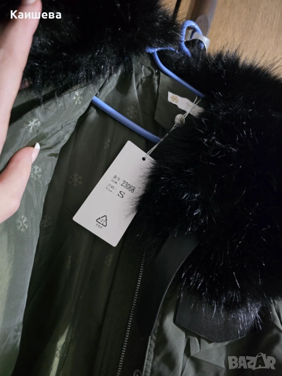 Дълго зимно яке в черен цвят с пух, ново с етикет. S размер по етикет, но може и за М тъй като все пак е яке, не е изцяло прилепнало, хем в горната част е по-тялото хем надолу е леко разкроено, има и колан.