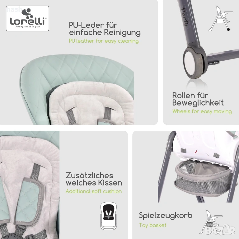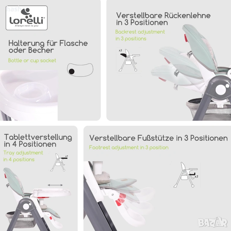 Този продукт е произведен в съответствие с Европейският стандарт за безопасност БДС EN 14988 - Детски високи столчета. Изисквания и методи за изпитване.