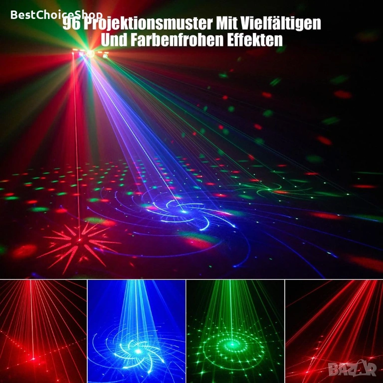 96 модела и ефект на магическа топка:Дизайнът с 4 лещи проектира 96 модела и до три лъчеви диаграми едновременно (други обикновено проектират само една). Централен звезден ефект с червени, зелени, сини и розови чипове за 15 ярки цветови режима и оживено светлинно шоу.