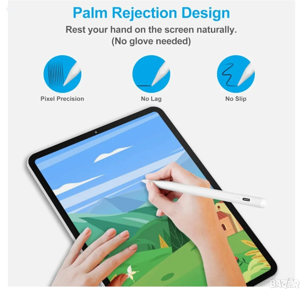 [Отхвърляне на длан] Стилусът за iPad с отхвърляне на длан осигурява естествено усещане за писане. Можете да поставите ръката си удобно върху екрана, както върху хартия, което ви дава по-голяма точност и контрол върху екрана.