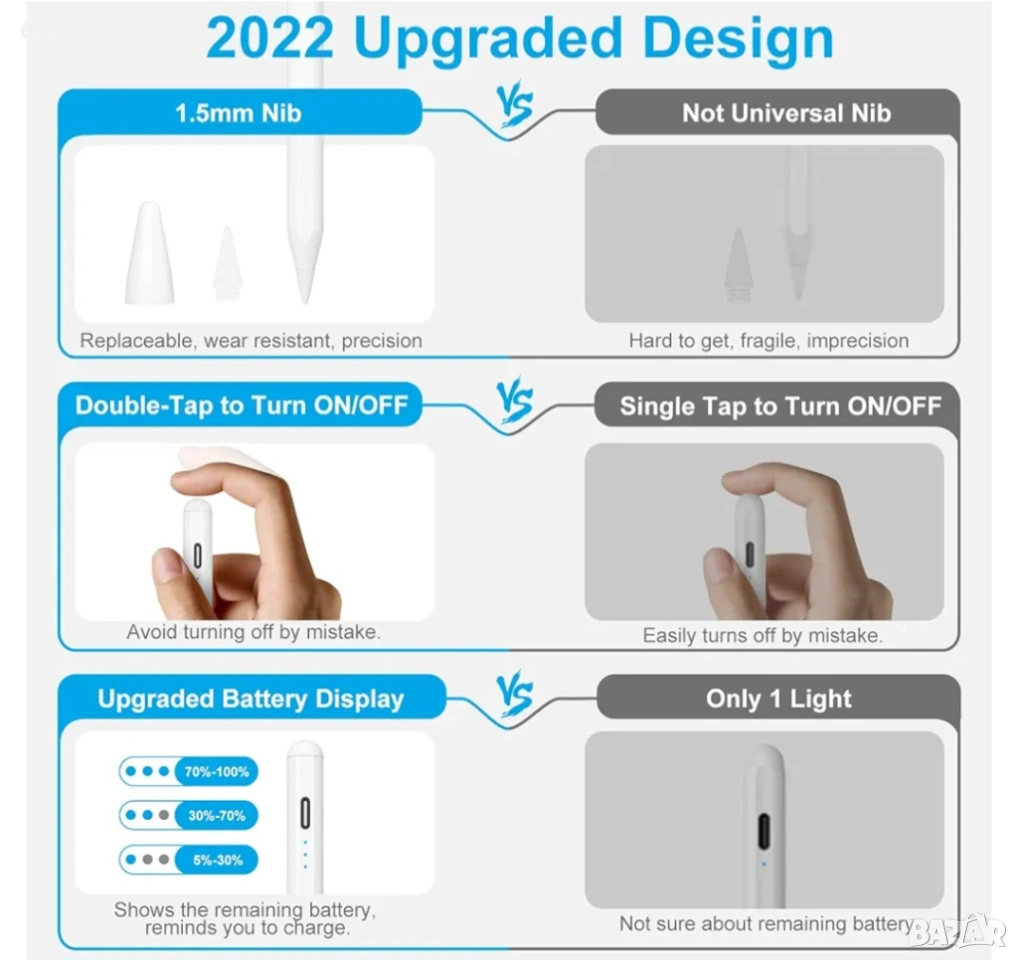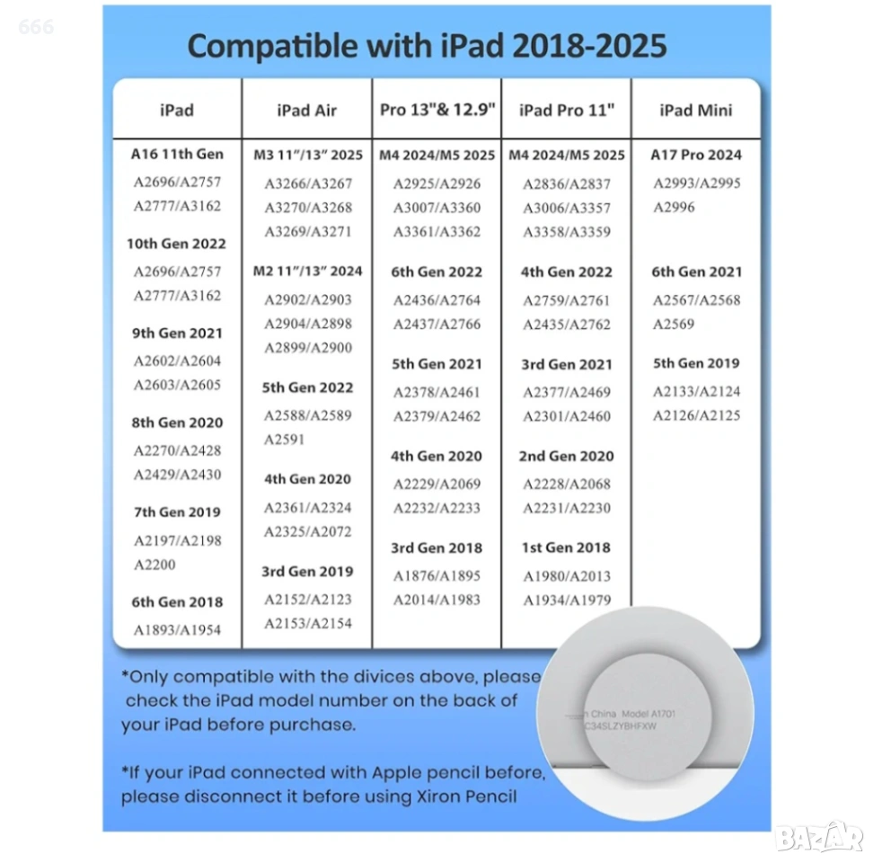 [Проектиран за Apple iPad 2025-2018] Стилусът не изисква Bluetooth връзка – просто докоснете двукратно горната част на писалката, за да го включите или изключите. Той е напълно съвместим с iPad Air (M2/2024, M3/2025) 11"/13"/5-то/4-то/3-то поколение, iPad Pro 11"/13" (M4/2024, M5 2025), iPad Pro 12.9" (6-то/5-то/4-то/3-то поколение)/11" (4-то/3-то/2-ро/1-во поколение), iPad 11-то поколение A16 2025/10-то/9-то/8-мо/7-мо/6-то поколение и mini 7-мо поколение A17 Pro/6-то/5-то поколение. Не е съвместим с iPad Pro 12.9" (1-во и 2-ро поколение), таблети с Android, iPhone или устройства на Microsoft.