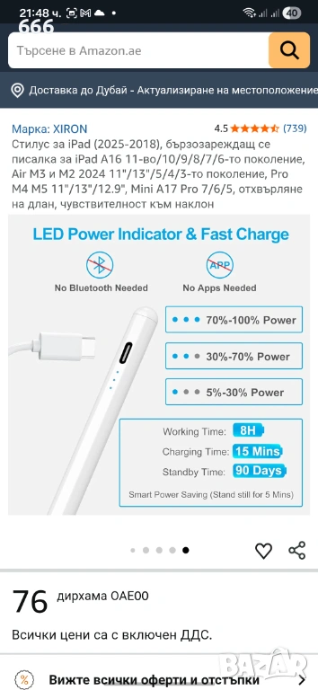 [Функция за автоматично заспиване и бързо зареждане] Стилусът автоматично влиза в режим на заспиване след 5 минути неактивност, за да пести енергия, и се събужда с двойно докосване. Оборудван е с 3 LED индикатора за състоянието на батерията. Поддържа бързо зареждане за по-малко чакане и по-дълго време за работа.