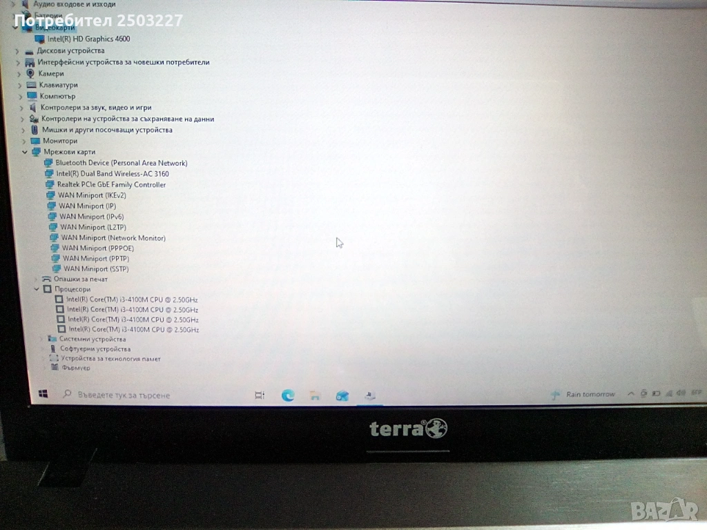 - Мрежова карта: Intel (R) Dual Band Wireless-AC 3160 , Bluetooth Divice (Personal Area Network) . Realtek PCIe GbE Family Controller