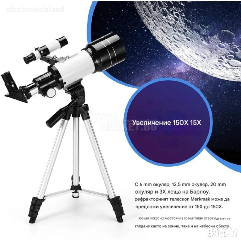 Оптична система с рефракторен дизайн: С обектив с диаметър 70 мм и фокусно разстояние от 300 мм, този телескоп осигурява ясно и детайлно изображение на Луната, планетите и звездите.