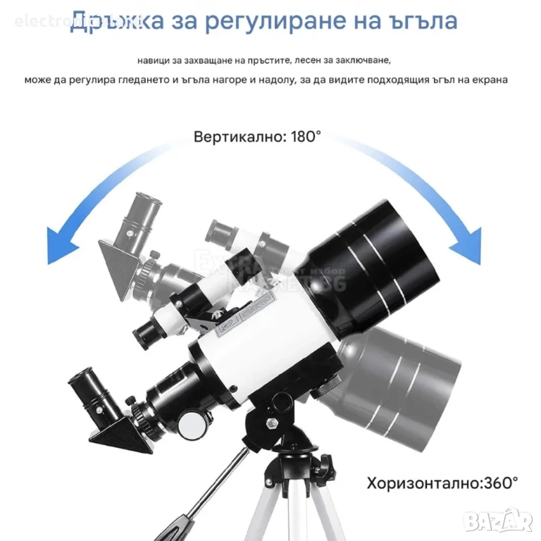 Устойчив статив: Алуминиевият статив осигурява стабилност и лесно регулиране на позицията на телескопа, за да следите точно желаните небесни обекти.