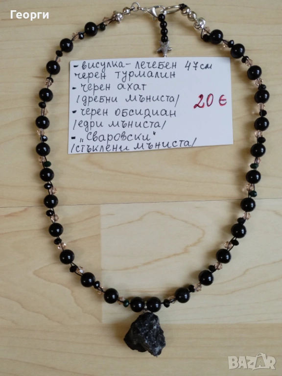 Стилно дамско колие с естествени камъни – черен турмалин (висулка), черен ахат и черен обсидиан, допълнени с фасетирани стъклени мъниста тип „Сваровски“. Елегантно бижу в класическа черна гама, подходящо за всякакви поводи.
