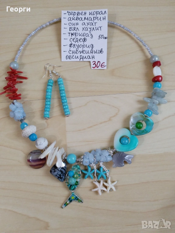 Уникално дамско колие в морски стил, изработено от естествени и полускъпоценни камъни. Дизайнът е вдъхновен от морето — с декоративни висулки рибка и морски звезди, които придават свежо лятно излъчване.